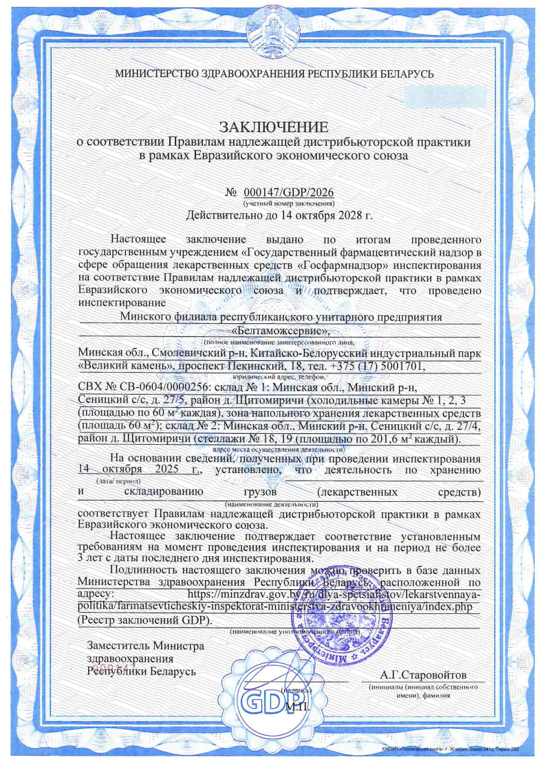 Подтверждает соответствие правилам надлежащей дистрибьюторской практики в рамках ЕАЭС и подтверждает, что проведено инспектирование