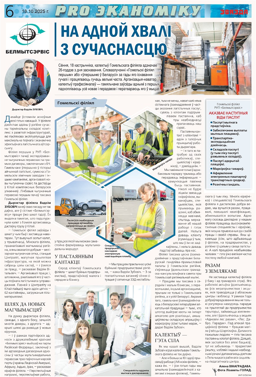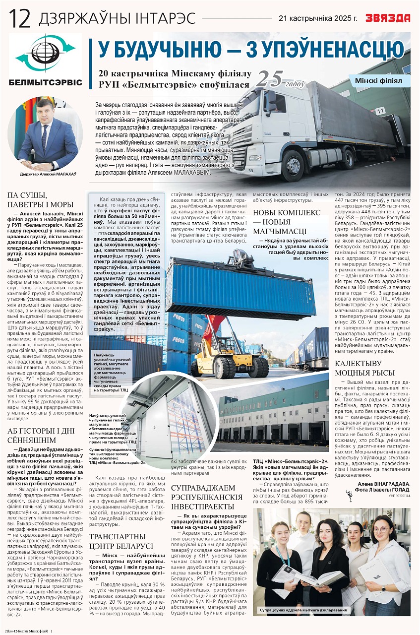 Продолжаем серию публикаций о филиалах РУП «Белтаможсервис» – тех, кто ежедневно обеспечивает бесперебойность поставок и укрепляет позиции белорусского экспорта. В свежих выпусках газеты «Звязда» – статьи о Минском и Гомельском филиалах: их достижениях, текущих задачах и планах на будущее.