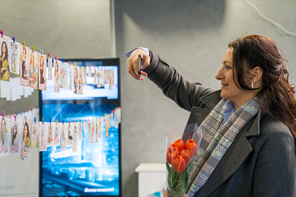 Но главный сюрприз ждал впереди. Бурю эмоций вызвал творческий подход мужской части коллектива к подготовке поздравлений. В этом году традиционное вручение цветов было дополнено современными технологиями: с использованием нейросетевой генерации – для каждой сотрудницы были созданы уникальные персонализированные открытки с художественными портретами. Откуда взялись все фотографии? Как успели нарисовать столько открыток? Это пока остается главной загадкой утра.