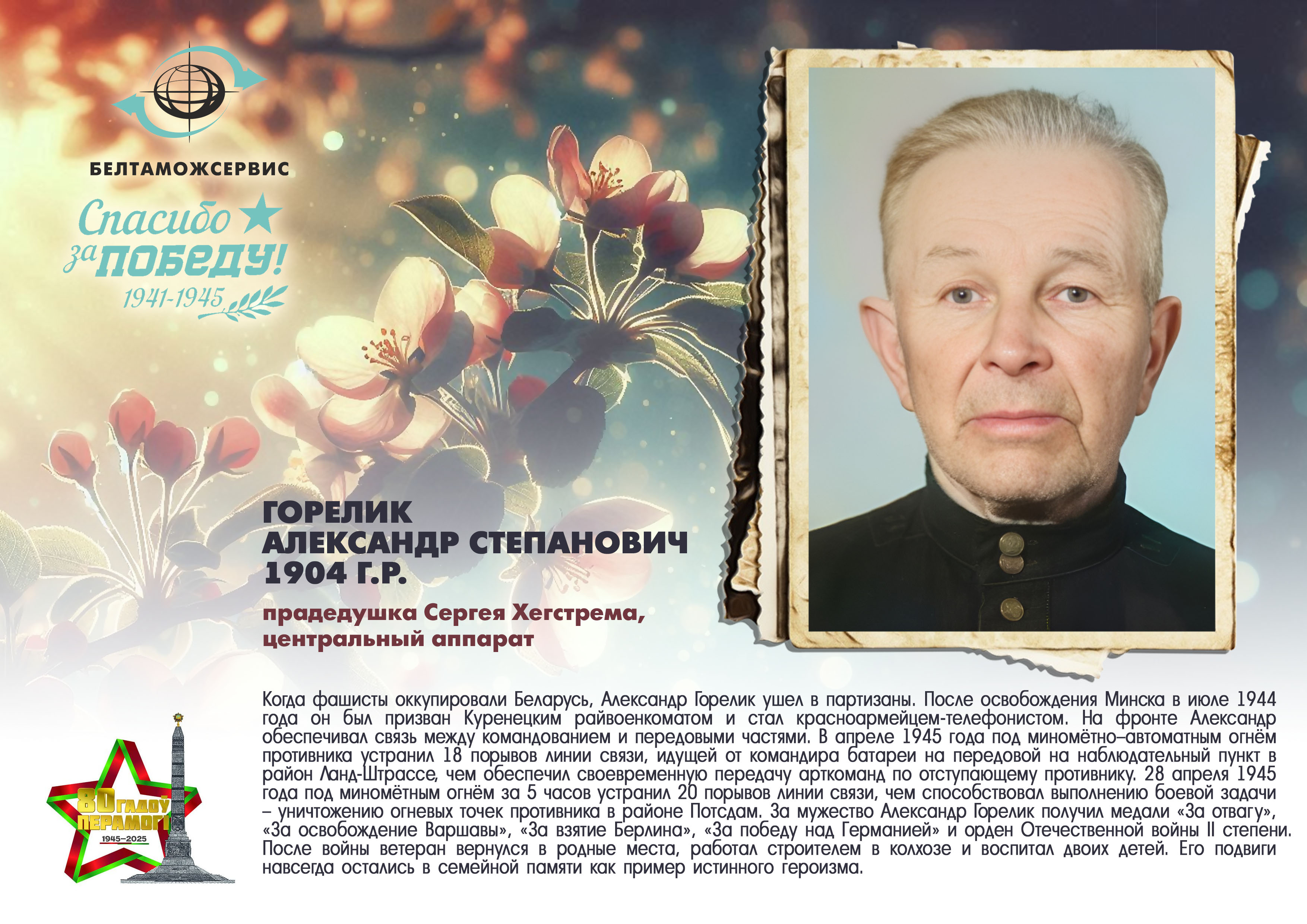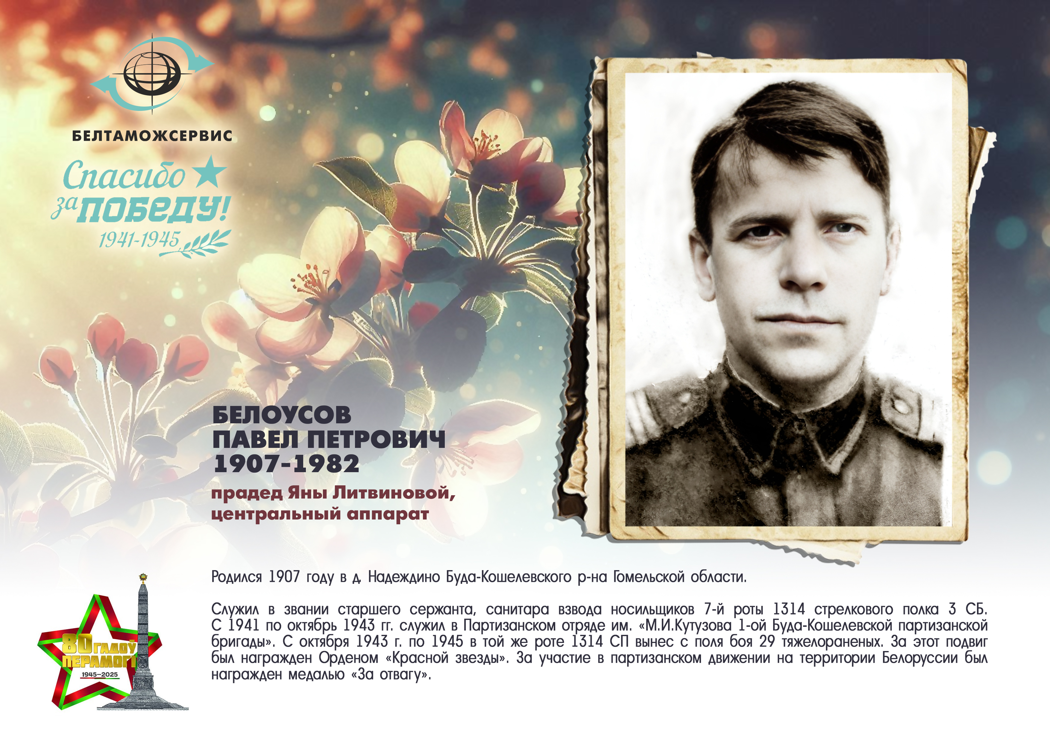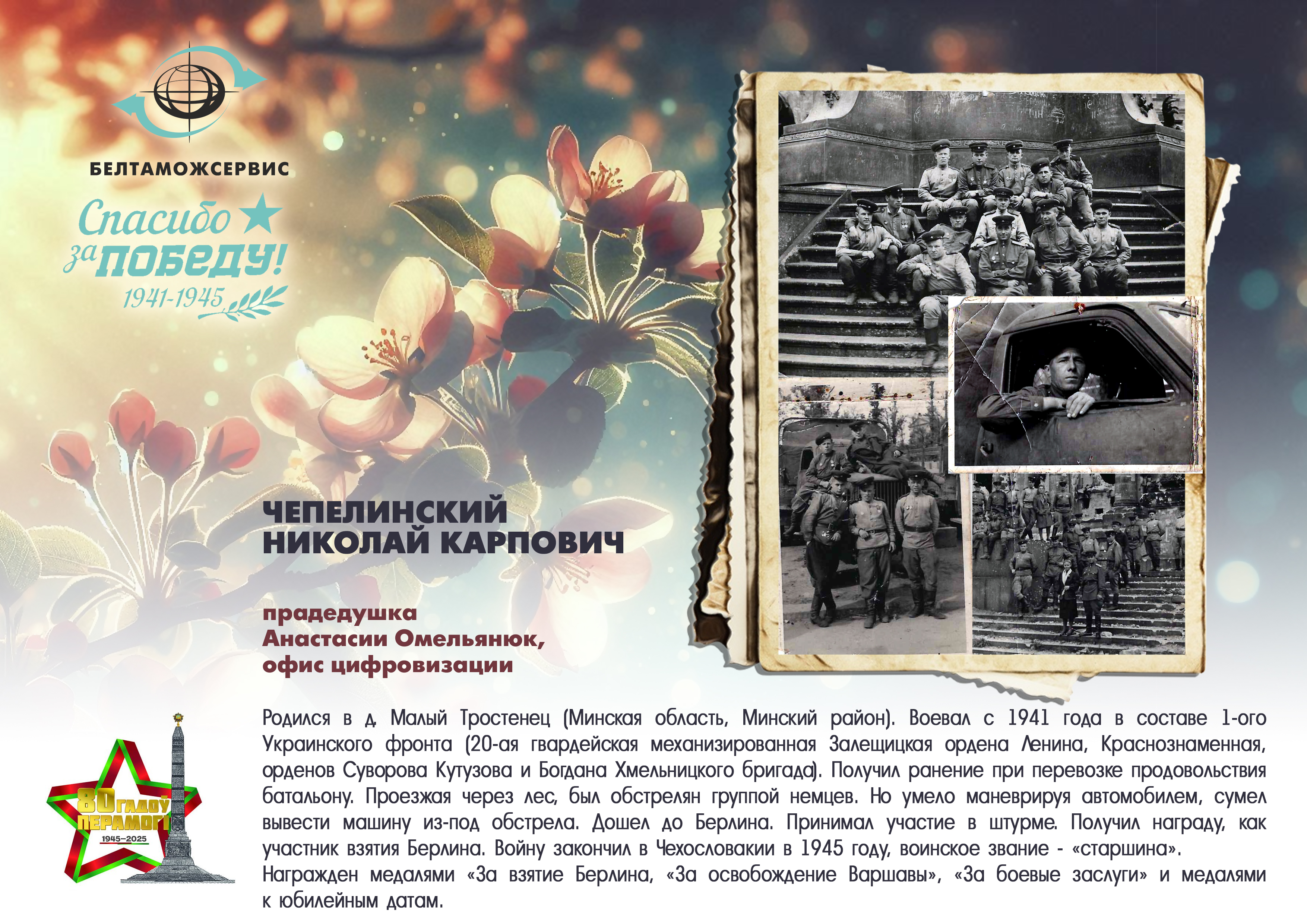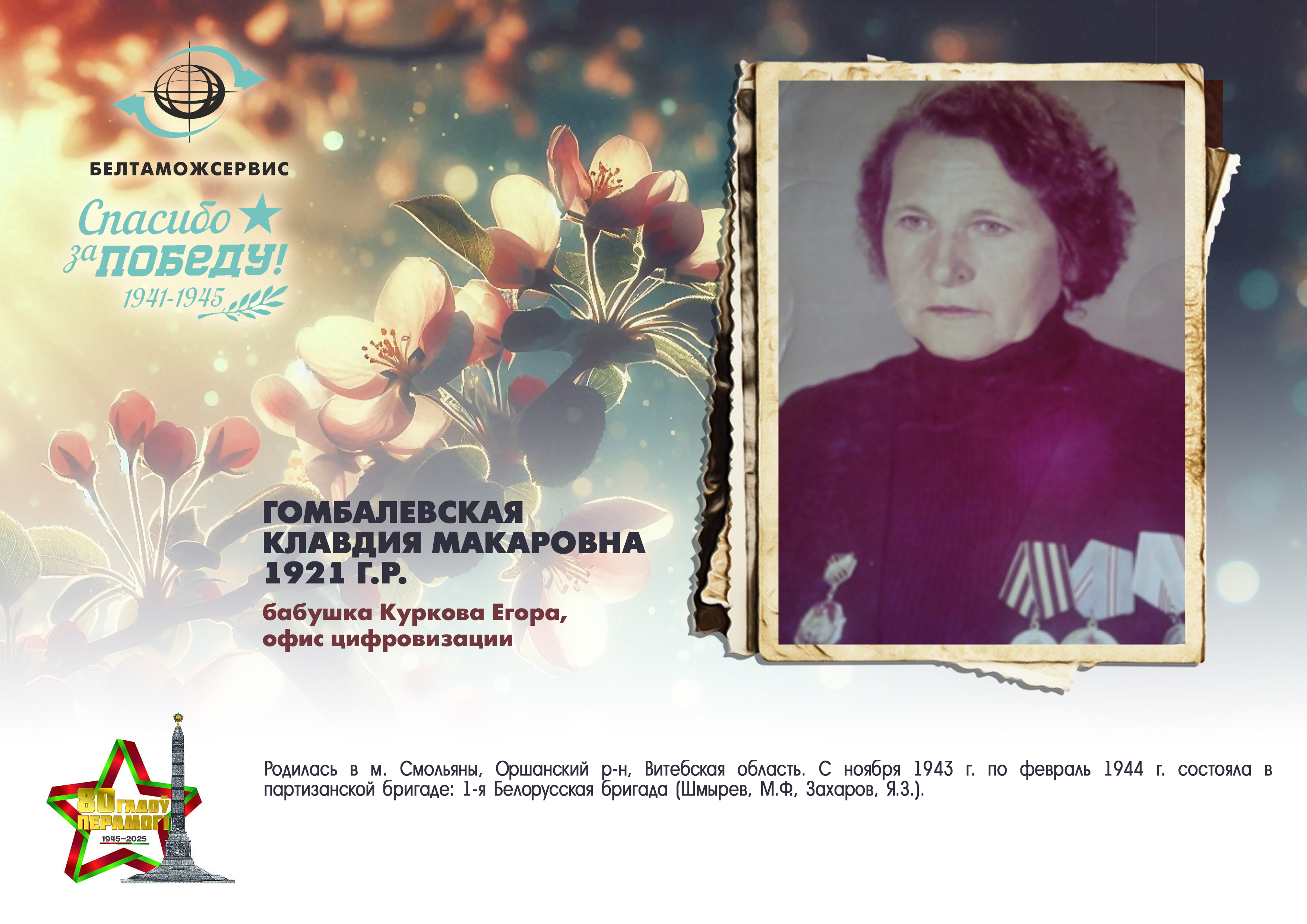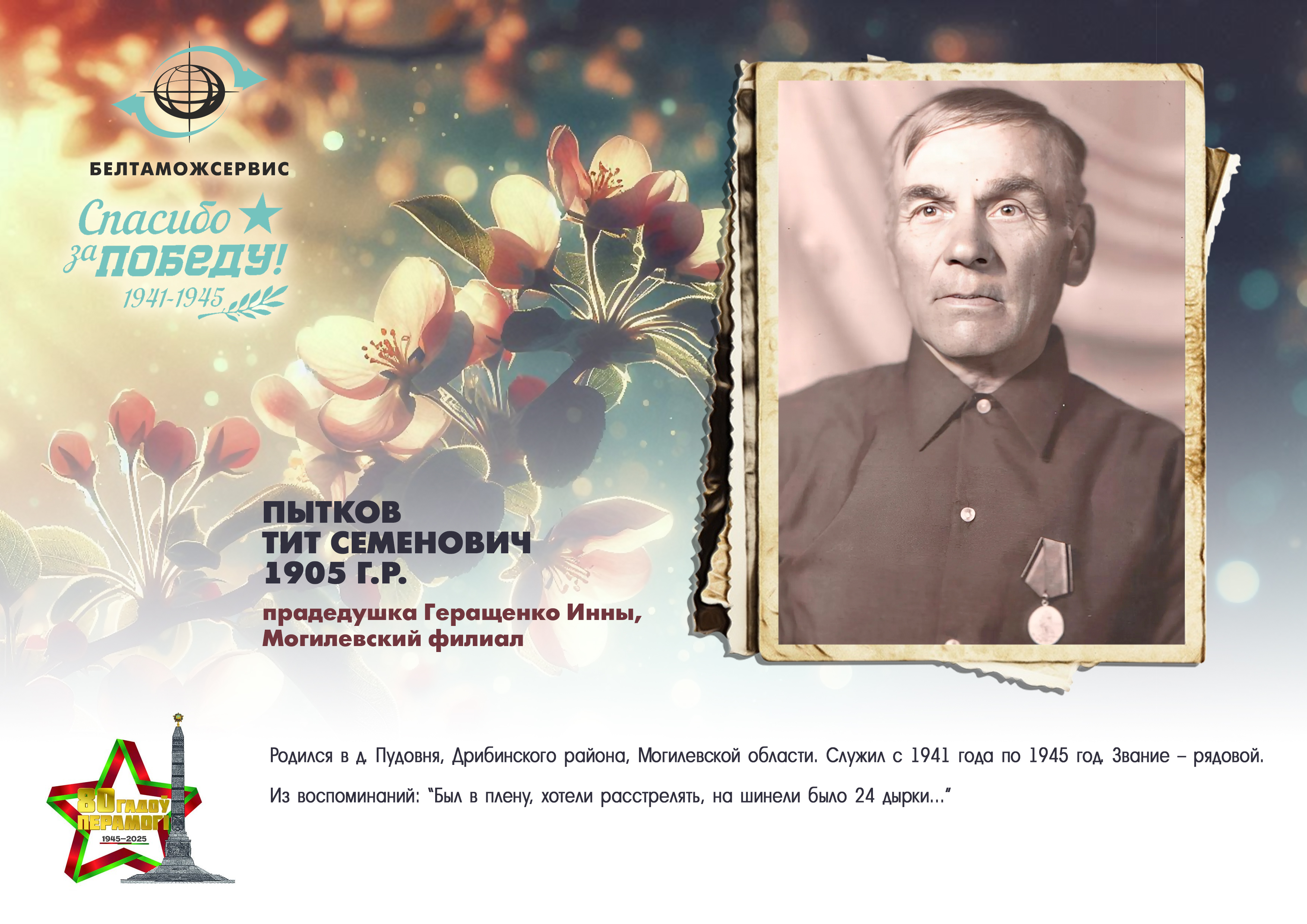 Пережитая трагедия, память о своих родных и гордость за их героические подвиги – в электронной выставке «Знают и помнят потомки: 80 лет Великой Победы», которую подготовили работники РУП «Белтаможсервис».