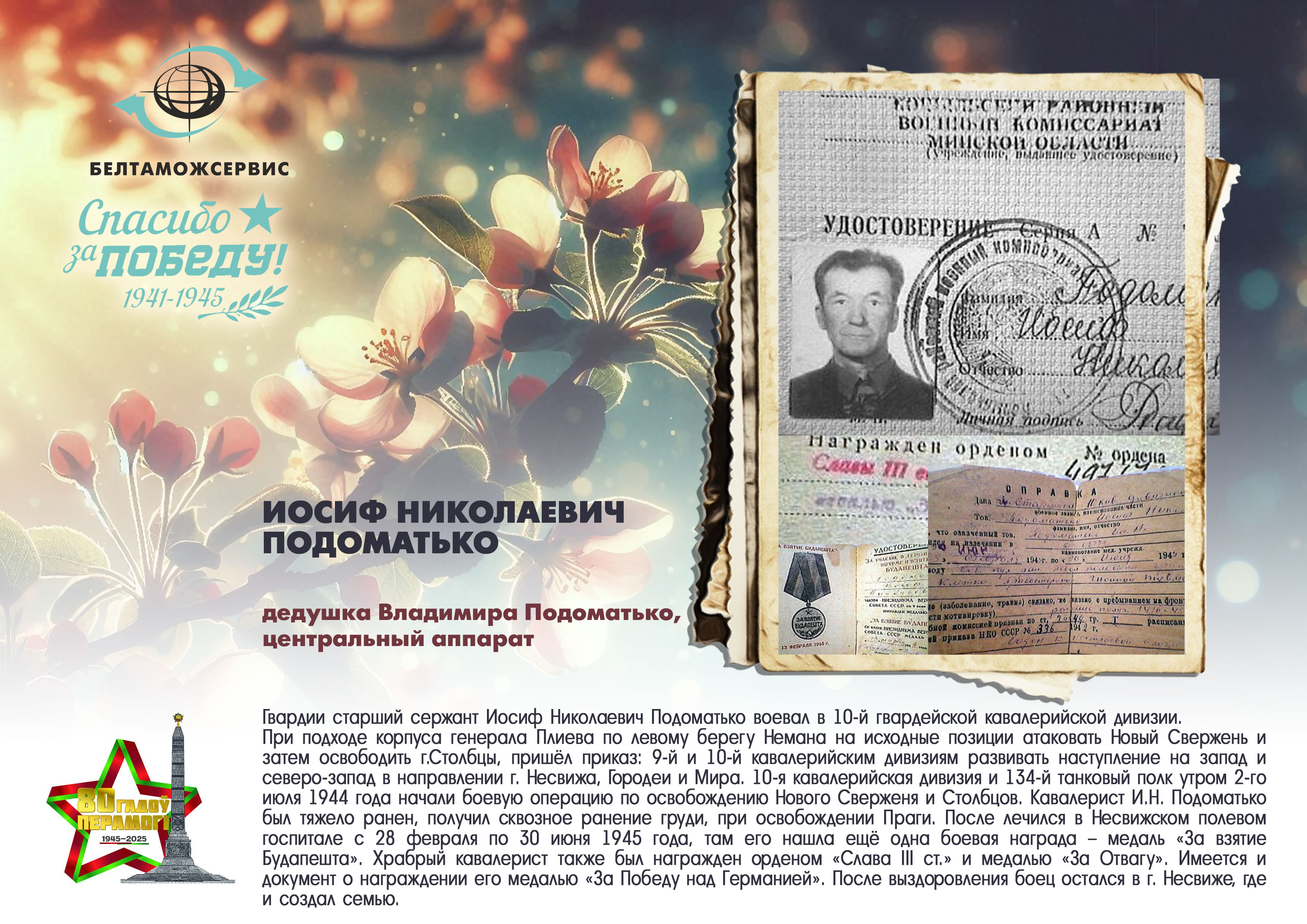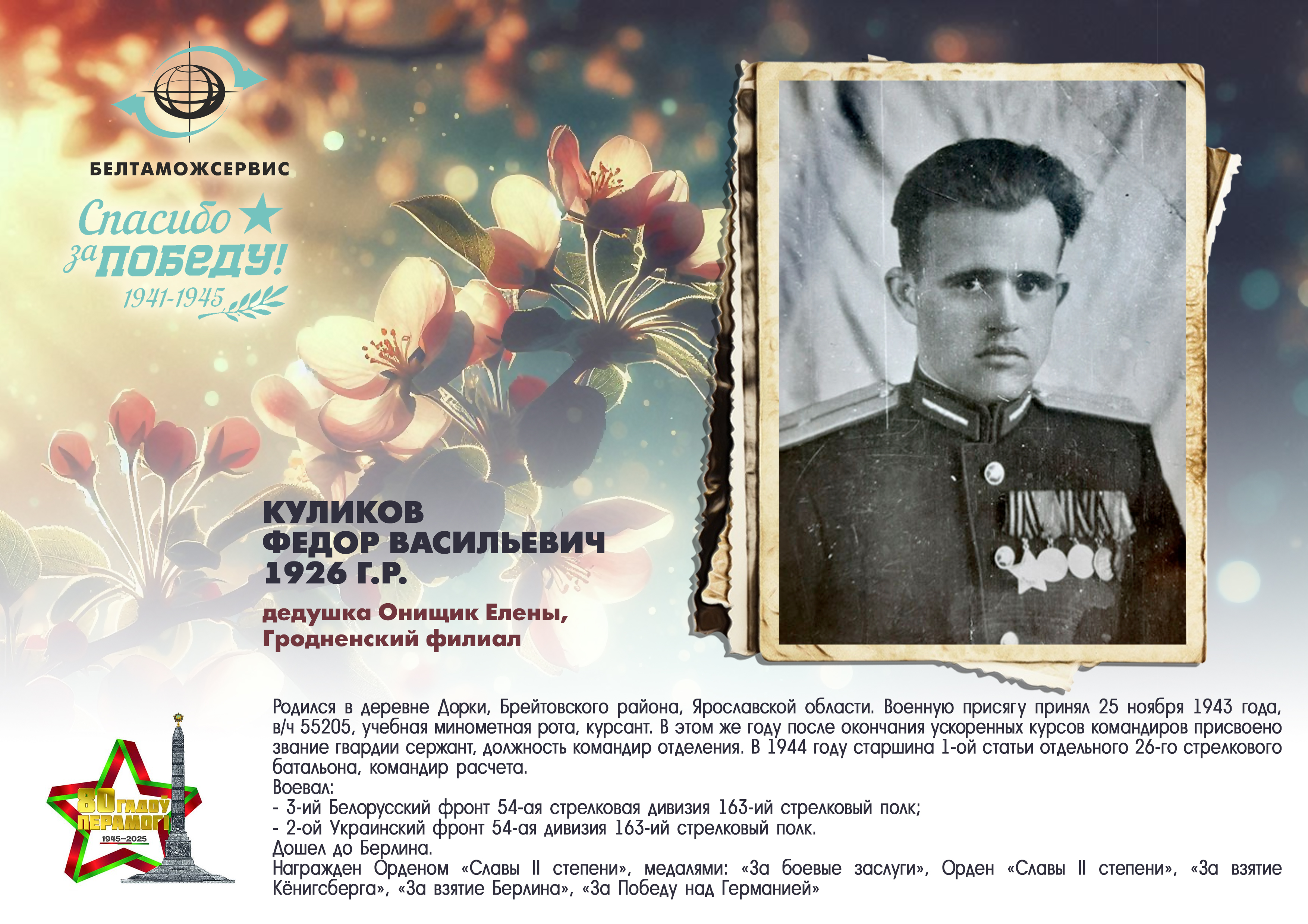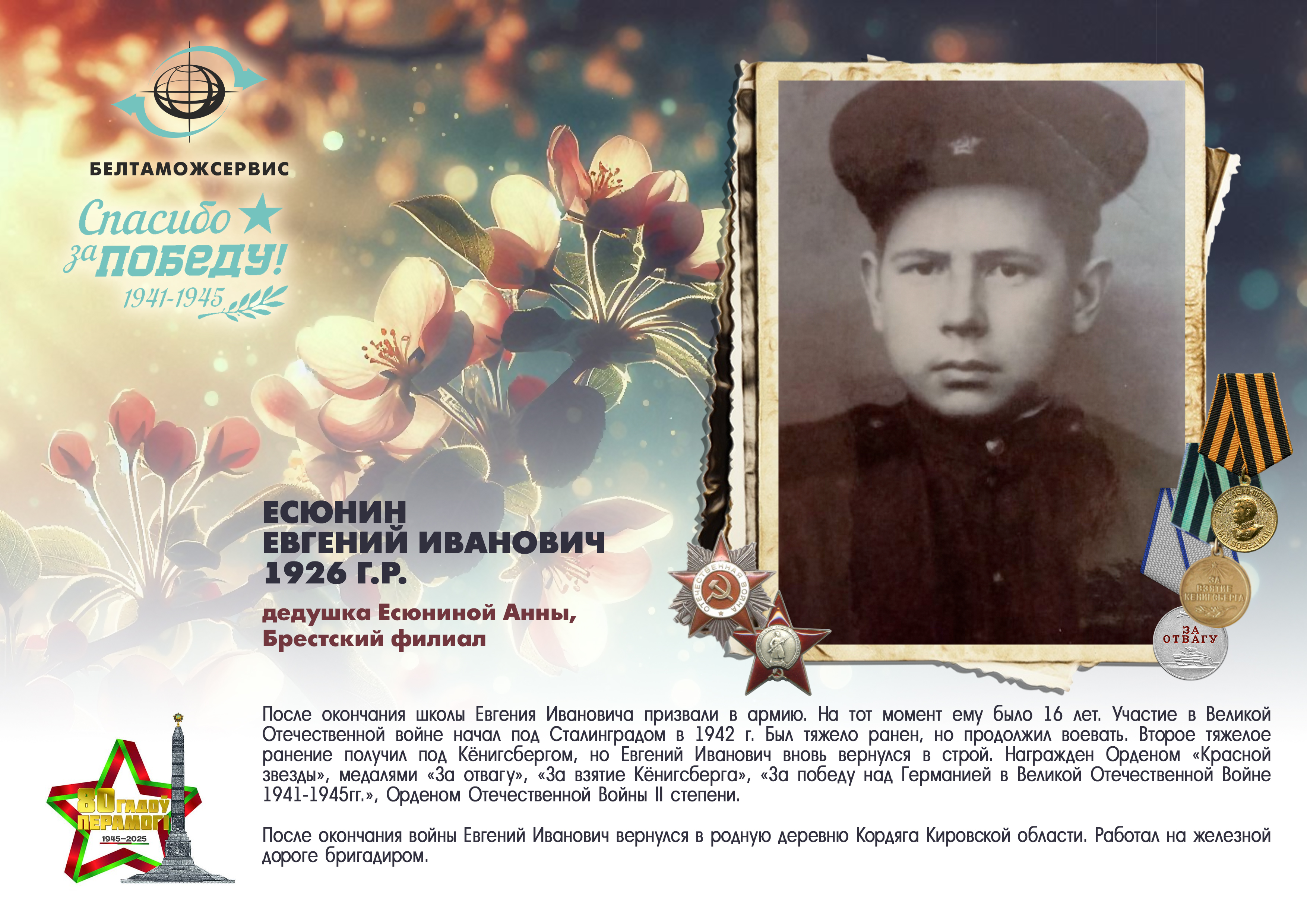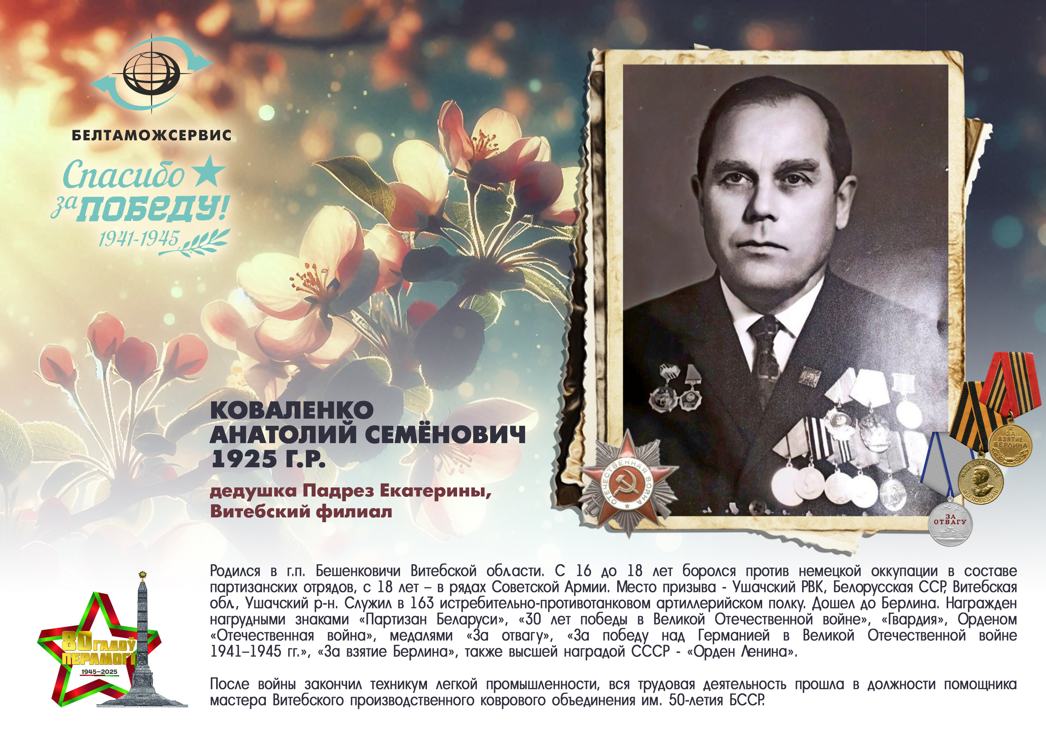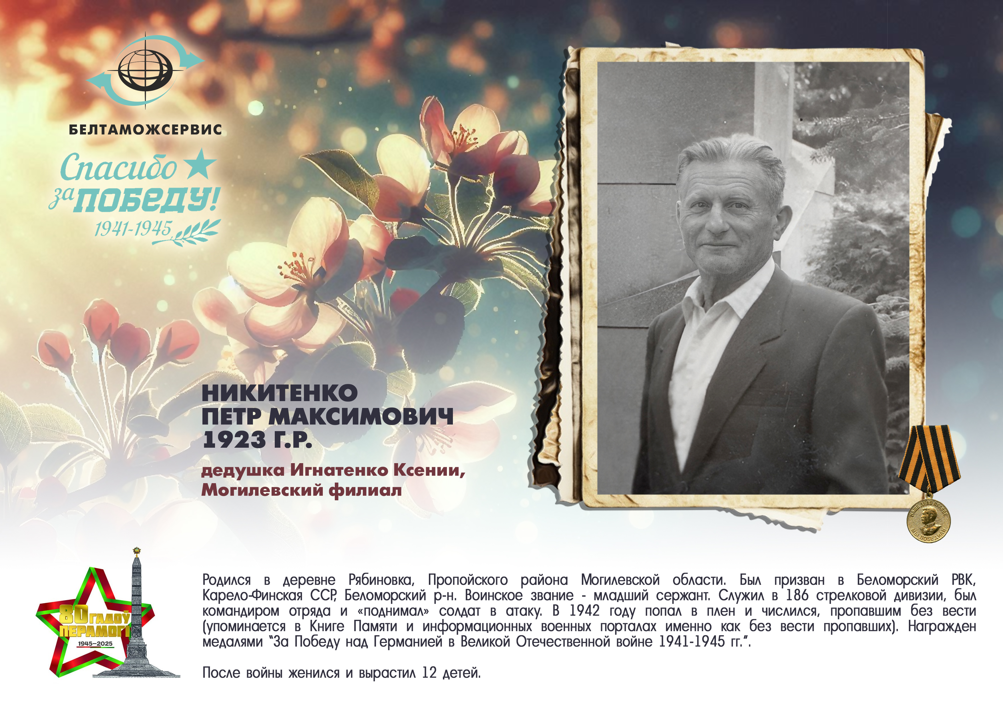 Пережитая трагедия, память о своих родных и гордость за их героические подвиги – в электронной выставке «Знают и помнят потомки: 80 лет Великой Победы», которую подготовили работники РУП «Белтаможсервис».